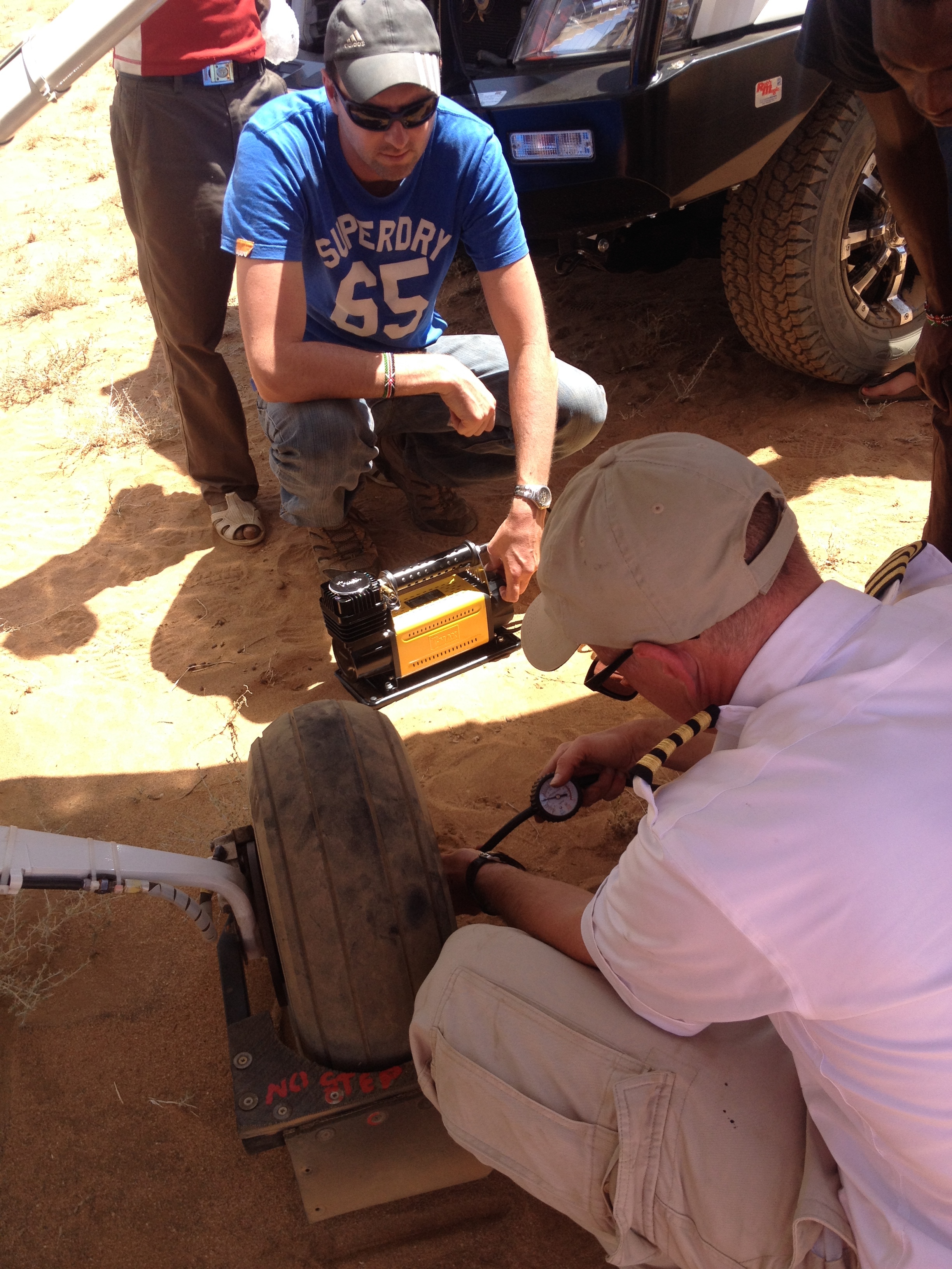 Dan went to the plane to retrieve his tools and came back with a small hand pump…this was going to take a while! When Mick saw the pump, he quickly interjected, “Wait, I have a brand new compressor we can use. I’ll get it!” They hooked it up to the car and the tire, and in a matter of moments, the tire was filled. Dan then spent the next 30 minutes completing the necessary tasks to ready the plane for takeoff again, giving the tire opportunity to show us how bad the leak was. Thankfully, in that time, very little air leaked from the tire, but the tire still needed repair, so Dan made the decision to divert to Kalacha where they had the tools and a shop to repair it properly. So with an efficient re-load of the freezer by the men, and quick goodbyes to our new friends, we climbed back into our seats and taxied for takeoff.