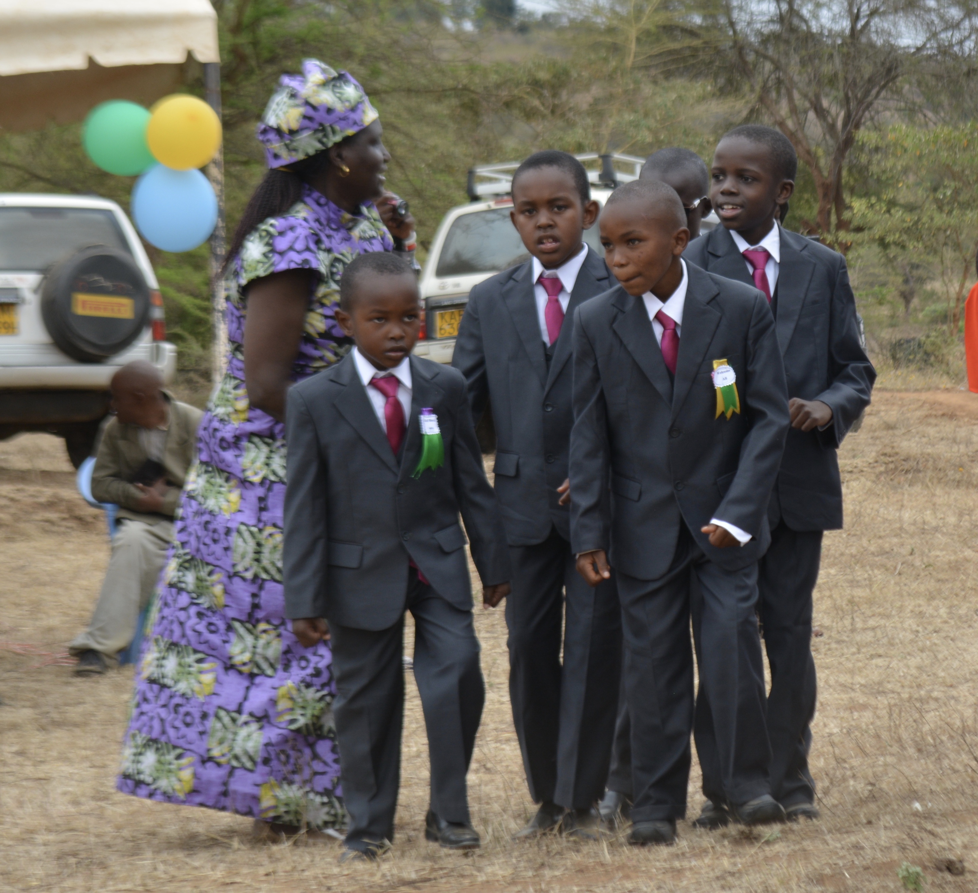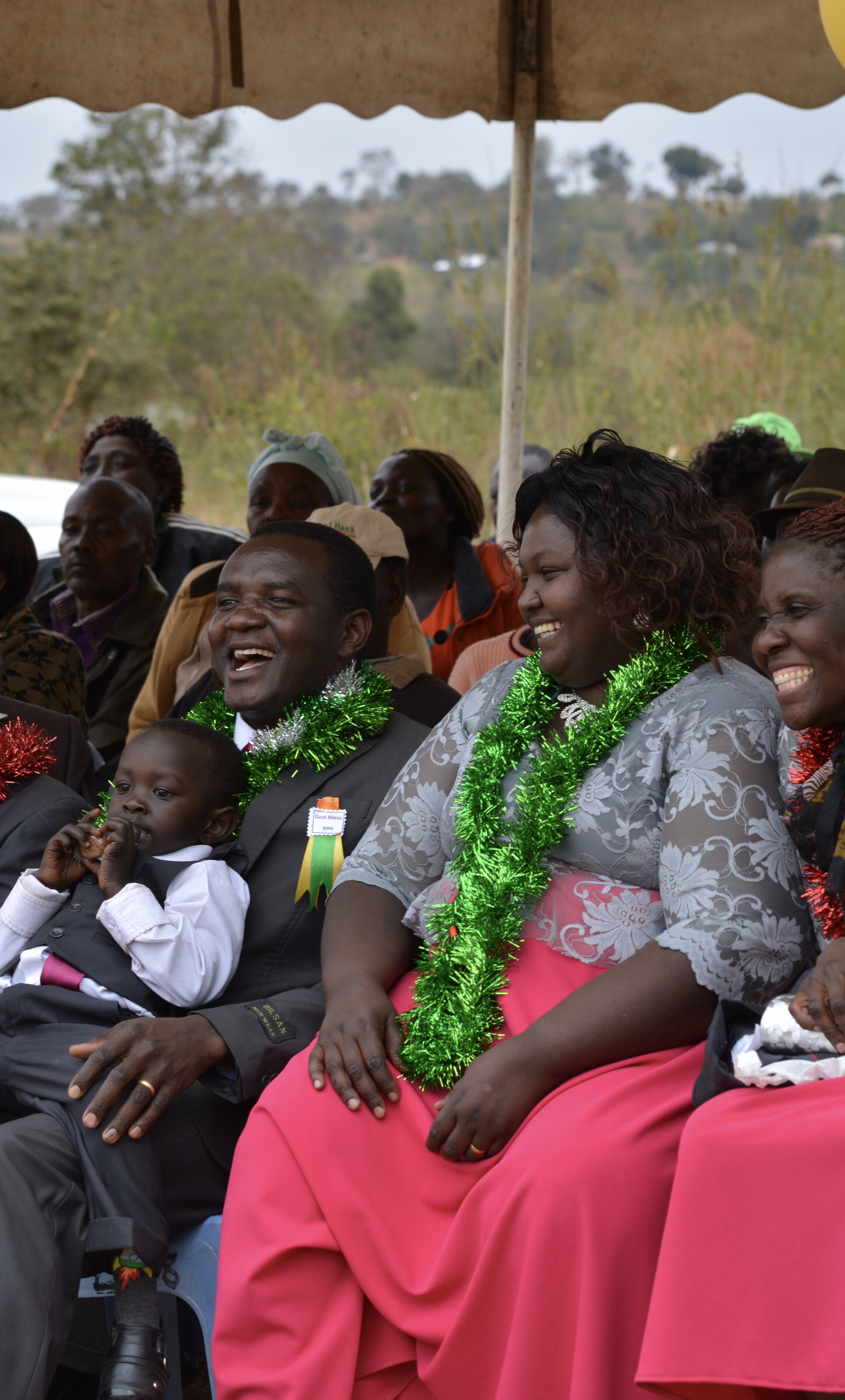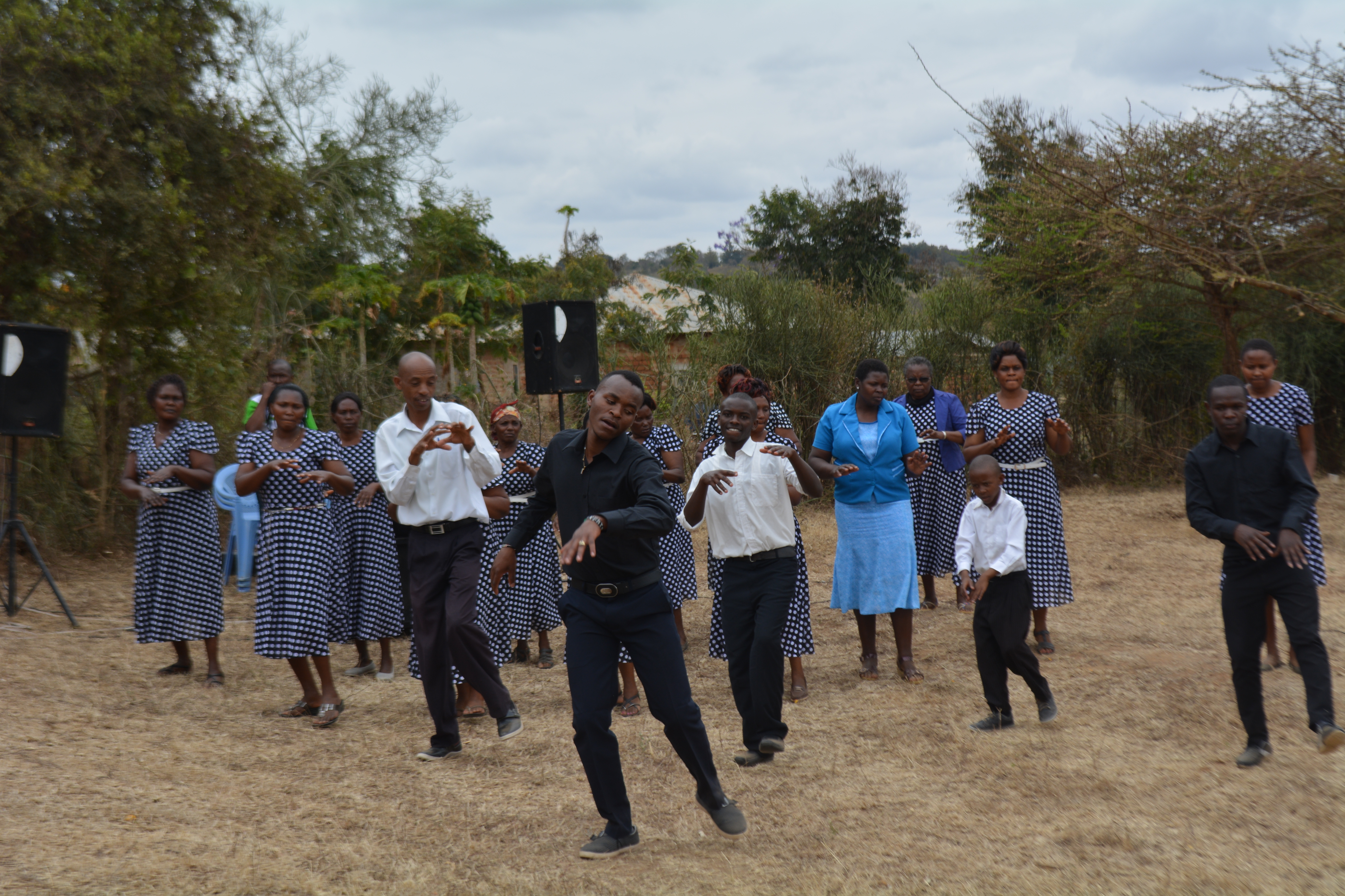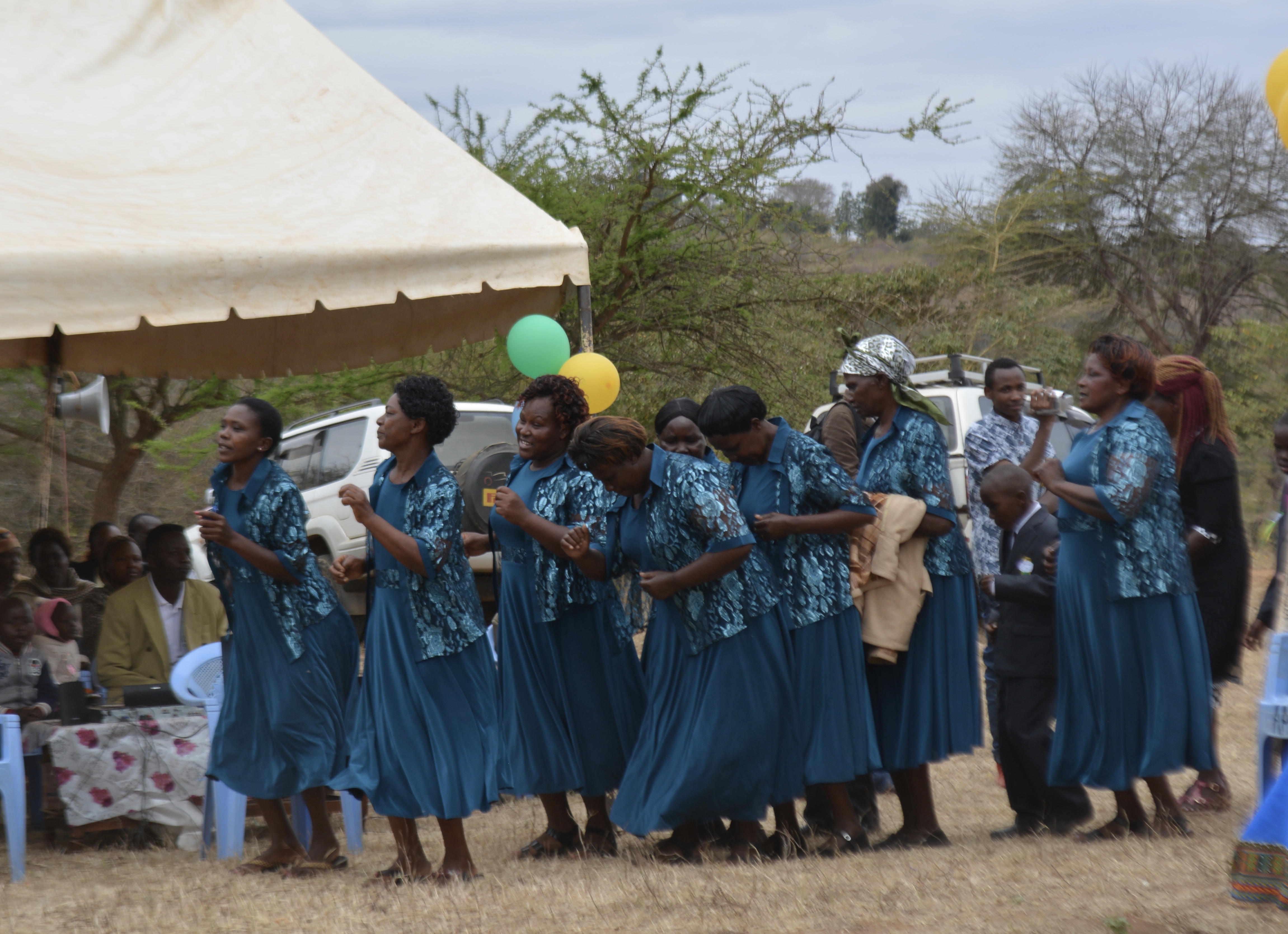 Later on in the ceremony when we looked around, we saw that nearly all of the Kenyans had purchased these guest ribbons as well. It was clearly a common Kenyan tradition in which everyone participates. Still sitting in our ‘guest tent’, the women in blue dresses joined the young men in dancing and singing to some Christian Kiswahili music.