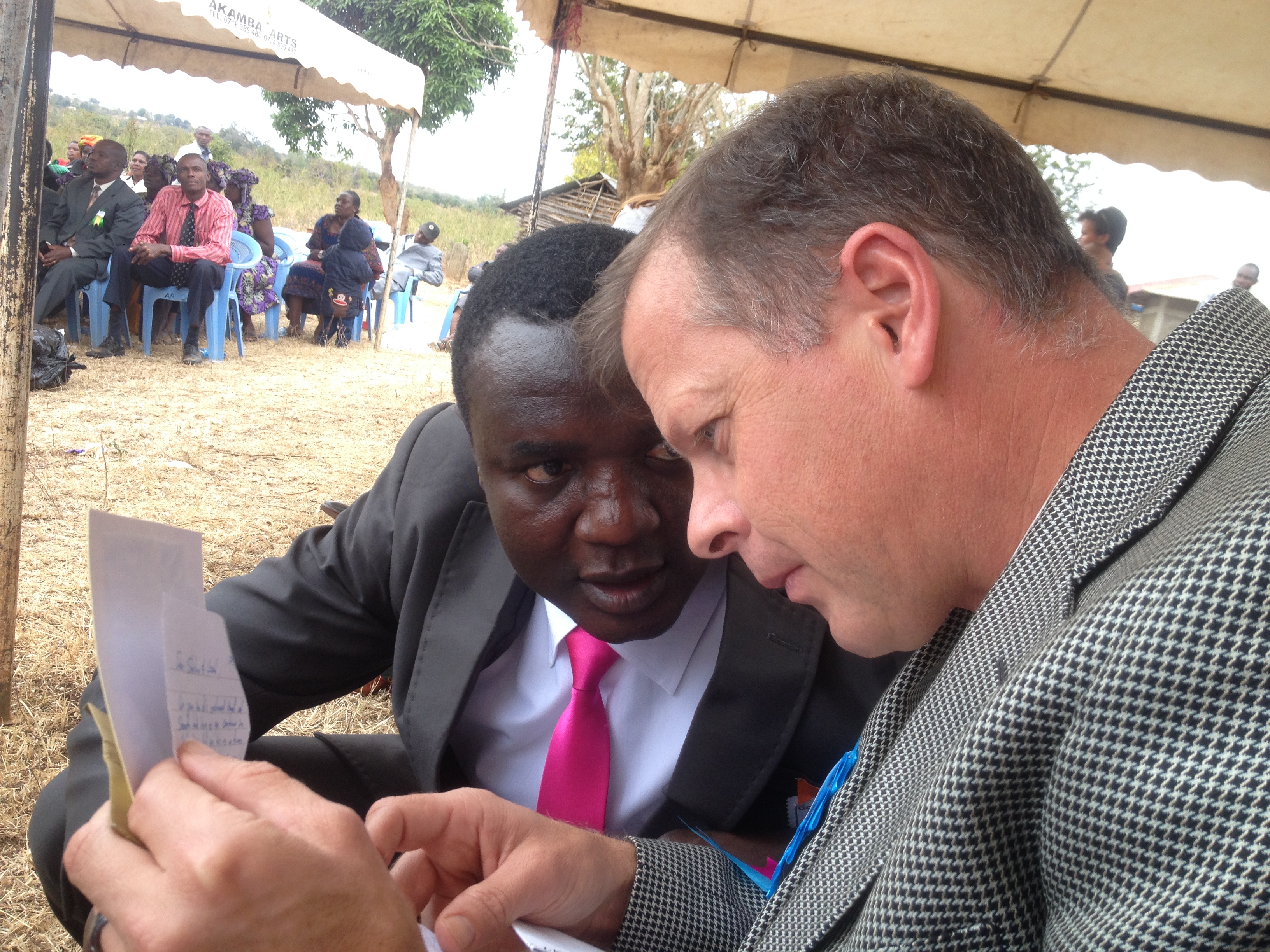 After a two and half hour drive through Nairobi and past the small bedroom community of Machakos, we finally arrived at Masii, an extra small community in ‘up-country’ Kenya. We followed the not so clear directions onto unmarked roads. We drove “through the football pitch, left for 500 meters, then right for another 500 meters to find the white tents in a large field”, as our directions instructed us. Along the way we passed a few pedestrians telling them where we were going. All seemed to know of the location we described and pointed us in the right direction. They, too, would be joining us there in a matter of hours. It appeared this event was to be a whole community event.