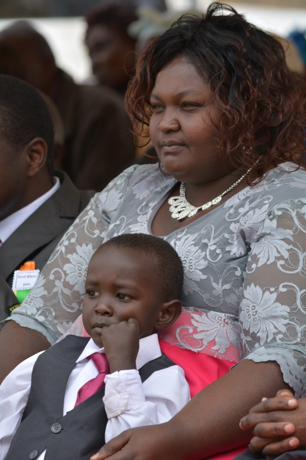 We noticed other women outfitted in dresses of bright, beautiful lavender and yellow Kenyan fabric with matching head wraps. The four tents set up in the dry, grass field were all labeled…one was for guests (where we were ushered to sit down), one for neighbors, another for the choir and the fourth for family.