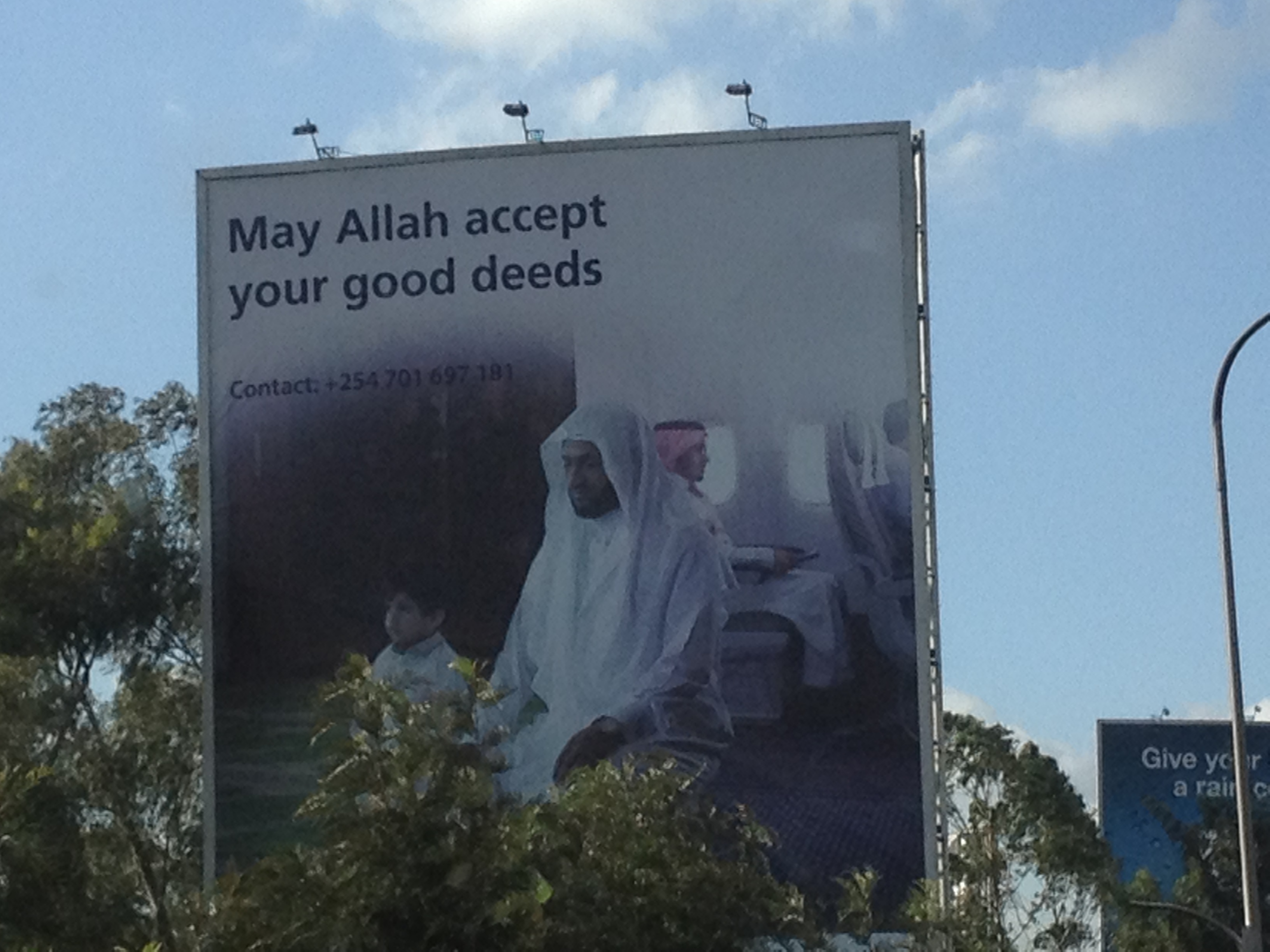 Sitting in the Nairobi traffic jam as I return home from work, I gaze through my window at the billboard across the street. I have passed this airline advertisement countless times. The caption reads in big letters: “May Allah accept your good deeds.” The photo captures a Muslim man seated on his flight, while in the foreground, a man and his son are praying in Mecca. The message is clear: remember your duty to go on pilgrimage to Mecca and teach your son to do likewise. The airline brings the two messages together hoping you will choose them as you make your travel to Mecca.