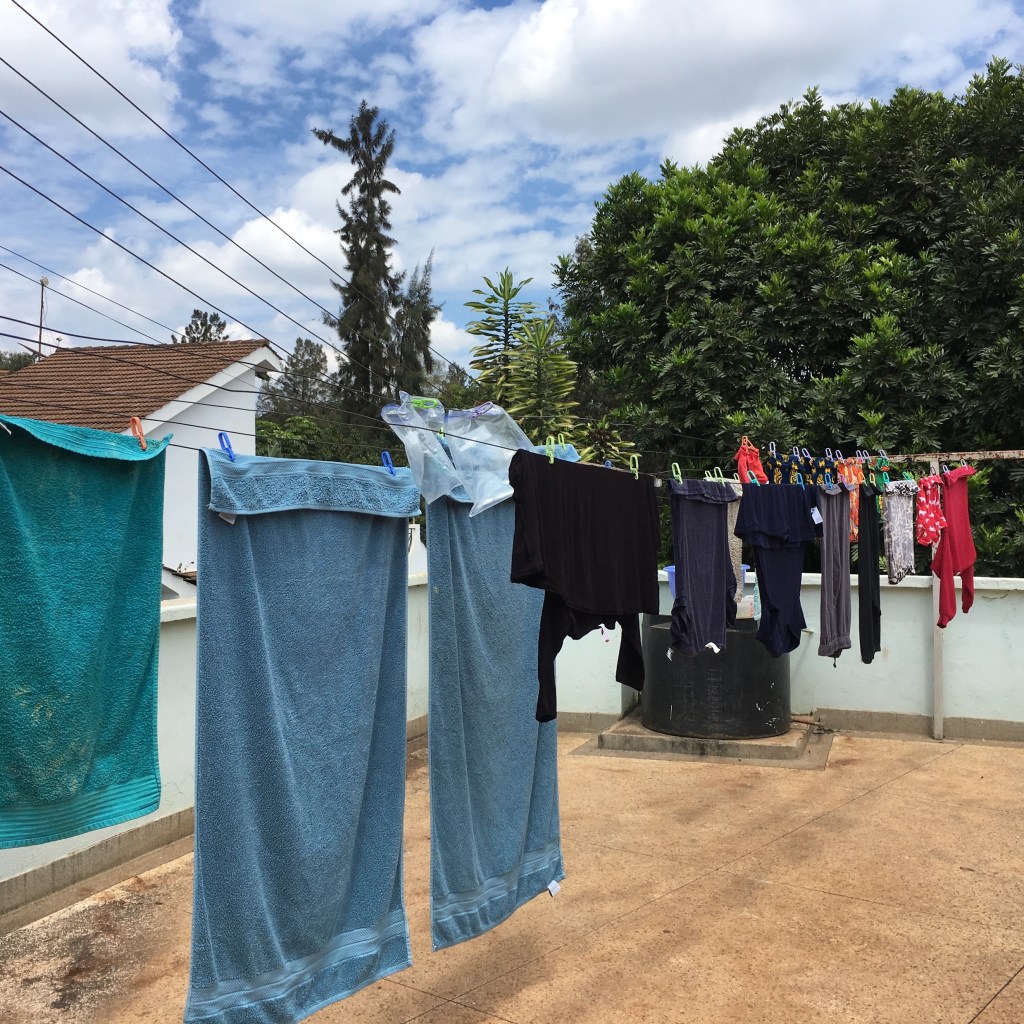 First, you need to have water. This may sound basic, but we don’t always have water here. Sometimes we do have water, but not enough to do a load of laundry. How can that be, you ask? Unlike in America, where water flows through your pipes in your house continuously, here, when we get water here, it flows into an underground tank in our backyard that holds about 2000 litres (about 440 gallons). Because we generally don’t get water every day, it becomes quite important to know the status of that underground tank before starting a load of laundry, or you may run out in the middle of the load. From that tank we have a pump that pumps the water up to our attic where a second tank resides, holding around 500 litres (110 gallons). It is from this upstairs tank that water is distributed throughout our home. When the outside tank runs out, then we are down to what is left in the upstairs tank, and that tank I cannot check, as it is in the attic. The other thing that’s nice to know is when we will be getting water next. Now this can be quite elusive. We are supposed to be on a nice schedule, knowing which hours on which days of the week water will flow into our tank, but alas, it rarely happens as planned, especially during the 15 months of drought in Kenya during 2016-2017. This really complicates the laundry conundrum. Now that summarizes just one part of the laundry equation here in Kenya.