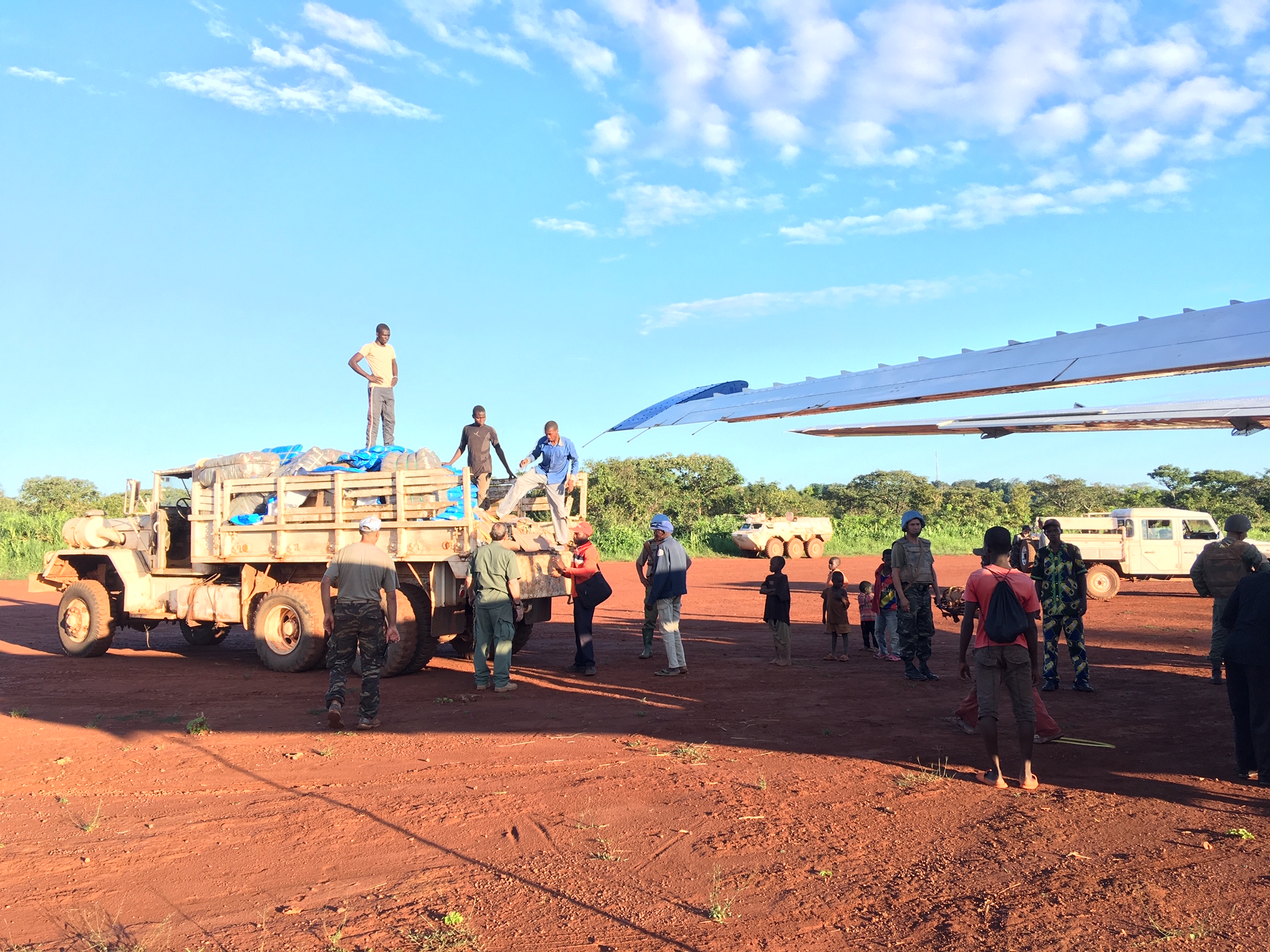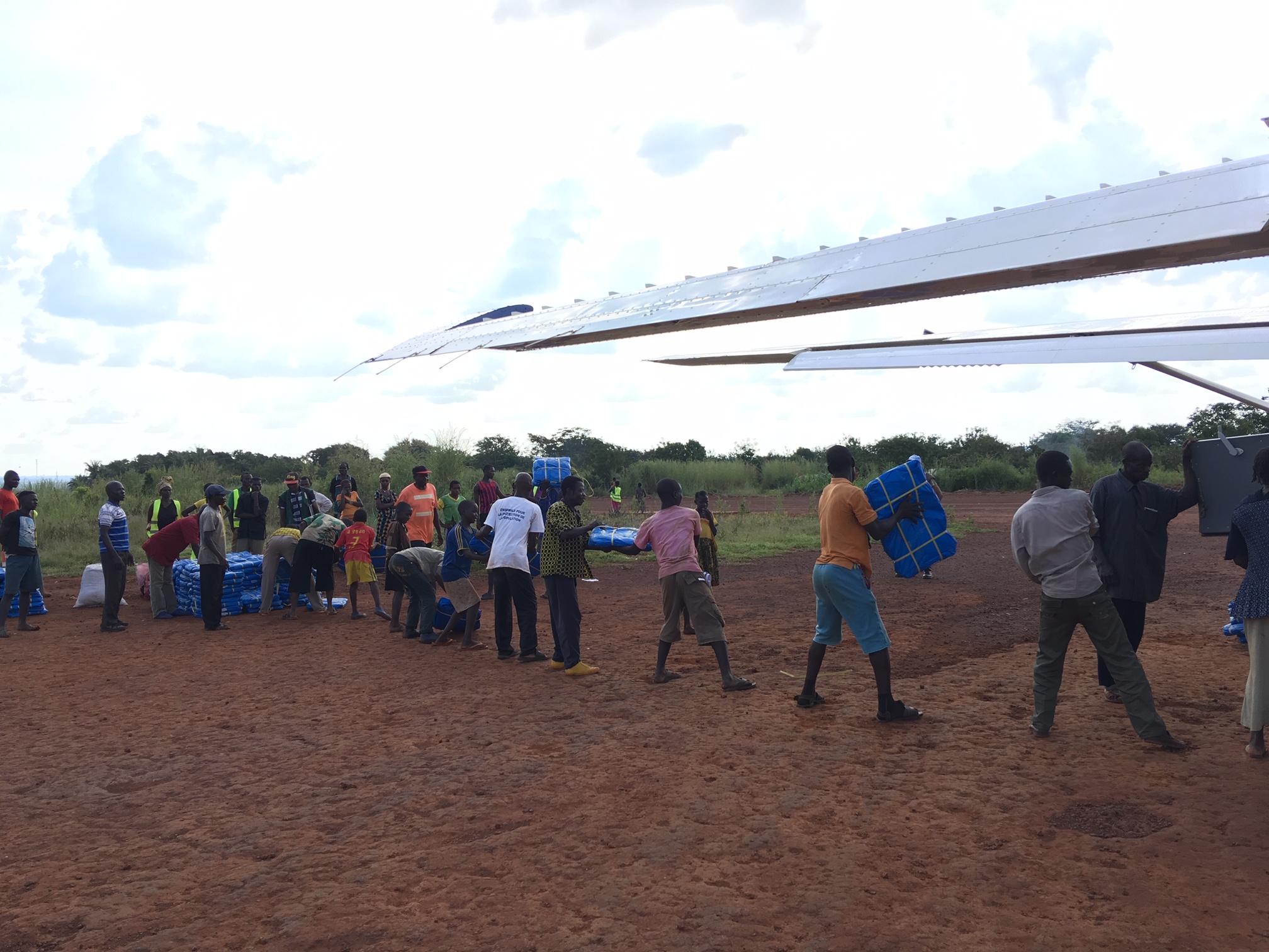 Mosquito nets, tarps, medicine, seeds, blankets and bedding are off loaded from the plane to begin their next journey by truck and boat to reach their final destination.