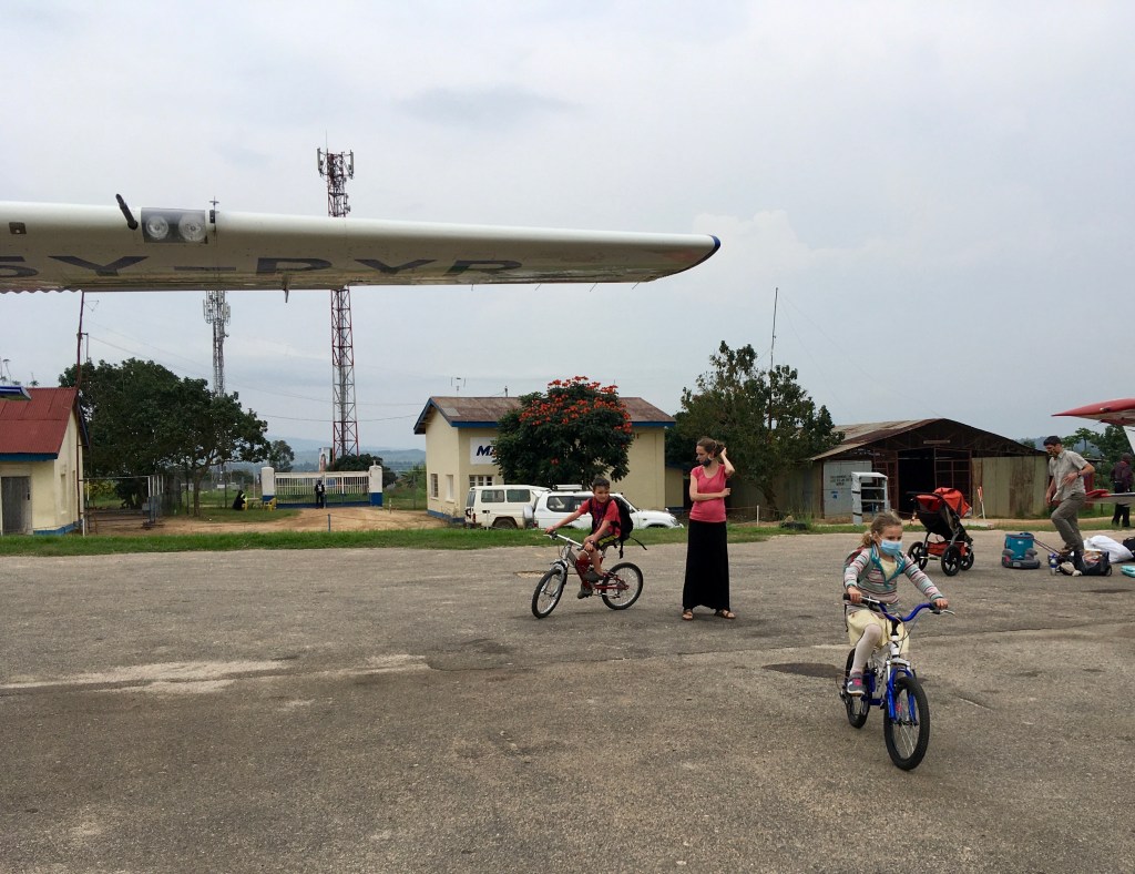 The reason for the return just 5 days later was to transport a young missionary family from Nairobi back to their home in the Congo. After a really long day of flying, the kids piled out of the airplane and jumped onto their bicycles that they had brought along on the flight. They were very excited to be getting back to their home in the Congo!